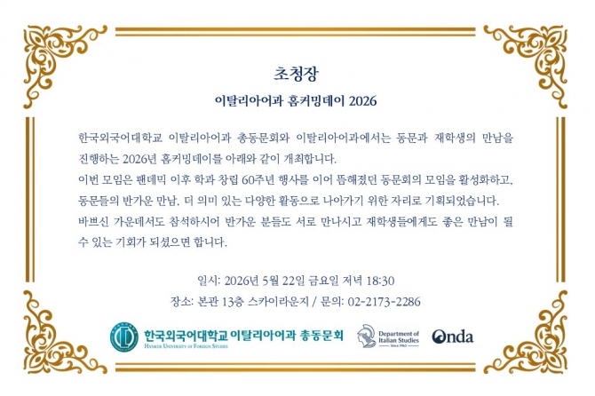 2026년 이탈리아어과 홈커밍데이 안내 [2026년 5월 22일 18:30, 한국외국어대학교 본관 13층 스카이라운지]